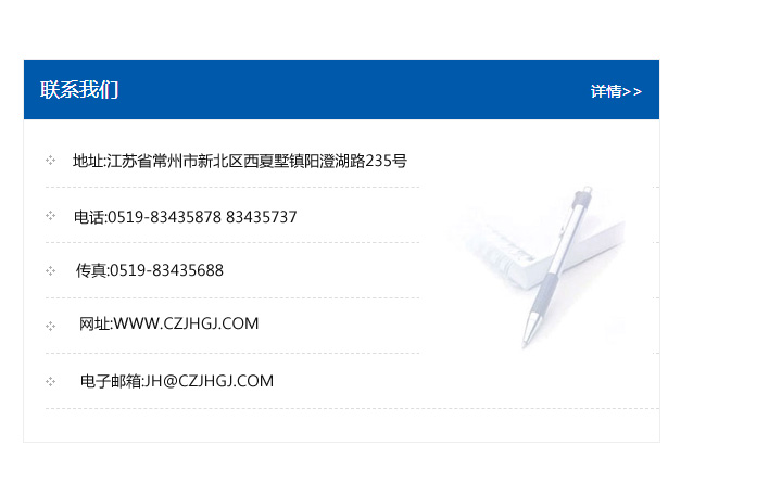 傳真:0519-83435688    郵編:213135    網址:WWW.czjhgj_com.zzmgzs.com    電子郵箱:JH@czjhgj_com.zzmgzs.com